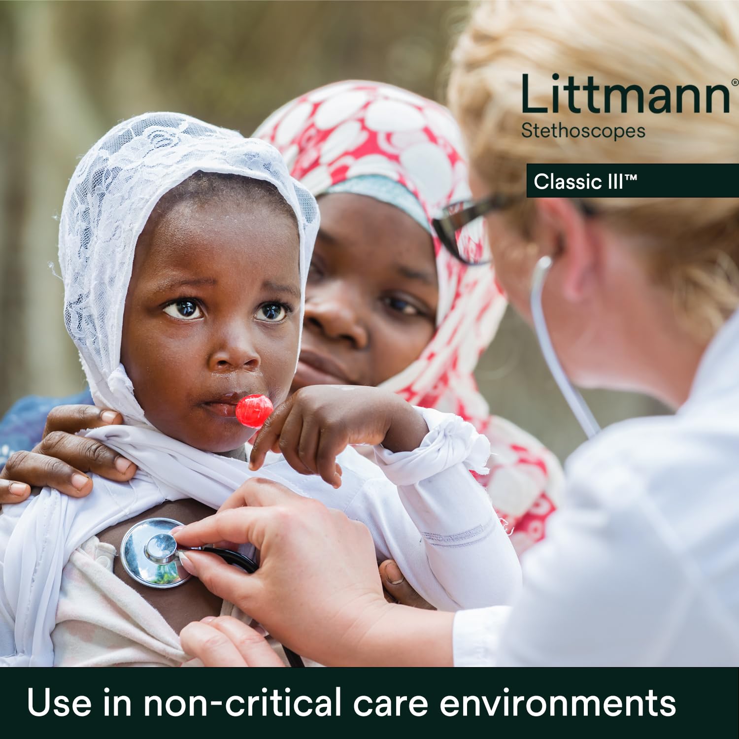 Product Description Love your stethoscope The compact and sensitive Littmann Classic III stethoscope is the perfect instrument for clinicians who monitor and assess children or adults in non-critical environments. Manufactured with strong yet lightweight materials for hours of comfortable use.The 3M™ Littmann® Classic III™ Stethoscope is the latest version of the stethoscope that helps millions of medical professionals achieve their best. The Classic III stethoscope offers high acoustic sensitivity for exceptional performance, plus a versatile two-sided chestpiece with tunable diaphragms. The Classic III stethoscope is used by students and medical professionals alike to identify, listen to, and study heart, lung, and other body sounds for physical assessment, patient monitoring, and diagnosis.Tunable diaphragm technology—a 3M invention—lets clinicians hear different frequency sounds by simply adjusting the pressure on the chestpiece. Hold the chestpiece with light pressure to hear low frequency sounds; press a little more to hear higher frequency sounds. This time-saving feature allows the healthcare provider to focus on the patient, while the non-chill diaphragm provides patient comfort.Headset tension is easily adjusted for head size and comfort by squeezing together or pulling apart the eartubes. Snap-tight, soft-sealing eartips conform to individual ears for an excellent acoustic seal and comfortable fit. Eartips snap firmly onto the ends of the eartubes and, for safety, require a significant effort to remove.Resilient next-generation tubing retains its shape and flexibility even after folding tightly into a pocket. It provides longer stethoscope life due to improved resistance to skin oils and alcohol, and is less likely to pick up stains. Next-generation tubing is not made with natural rubber latex, a benefit to sensitive medical professionals and their patients. And, to play its part in the protection of human health and the environment, the next-generation tubing does not contain phthalate plasticizers.The Classic III stethoscope is made in the USA for consistent quality. It comes complete with large and small soft-sealing eartips, non-chill bell sleeve, and instructions.Put the power of improved listening in your pocket with the Littmann Learning App. This powerful app is designed to help users better recognize benign and pathological heart sounds, murmurs, and lung sounds. It reinforces learning by offering self-directed learning modules directly on your phone. You can download the free Littmann Learning App now from the App Store® or Google Play Store®. *Expanded content is available with a subscription. Manufacturer Contact Information 18002283957