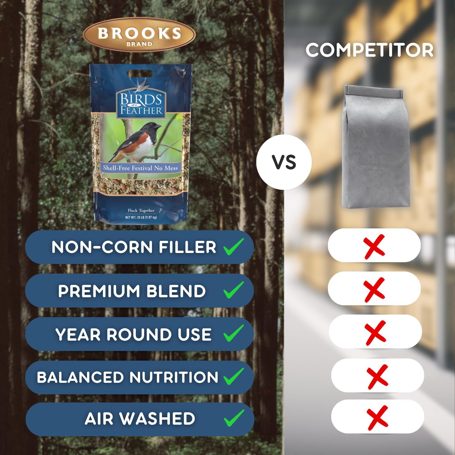 Birds of a Feather Shell-Free Festival is a premium, no mess bird seed mix made in the USA for clean, waste-free feeding. This blend of hulled millet, sunflower chips, peanut pickouts, tree nut pieces, and pepitas delivers high protein and fat to energize your favorite backyard birds. With no shells or fillers, it’s perfect for patios, decks, or feeders where mess control is important. This blend is compatible only with tray, platform, and tube feeders. It is not suitable for hopper, caged, or enclosed-style feeders due to ingredient size and texture. The non-germinating ingredients also prevent unwanted sprouting under feeders. Attract a wide range of wild birds—like goldfinches, blue jays, cardinals, and more—while keeping your space neat and tidy.