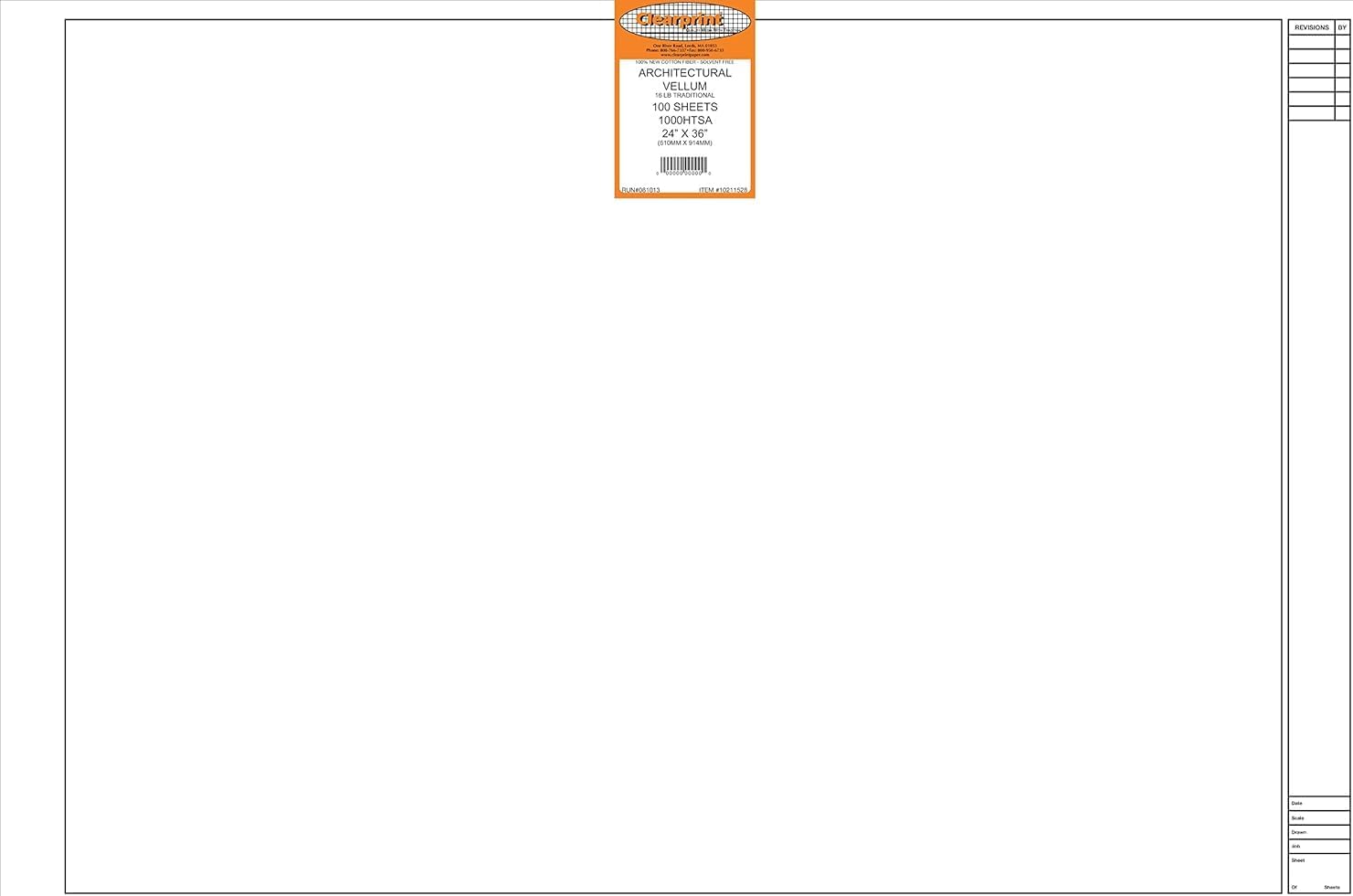 Use Clearprint 1000H Design Vellum Sheets with Architect Title Block, 16 lb., 100% Cotton, 18" x 24", 10 Sheets Per Pack to produce professional drawings with translucent paper made of 100% new cotton fiber. This paper boasts acid-free archival quality, strength, erasability without ghosting and redraw characteristics. Pre-printed title block clearly identifies and organizes multiple versions of plans. Use with pencil, ink and traditional drafting products. Paper is transparentized without solvents to produce a permanent transparent drawing surface, which is also printable in laser and inkjet printers. Made in USA.