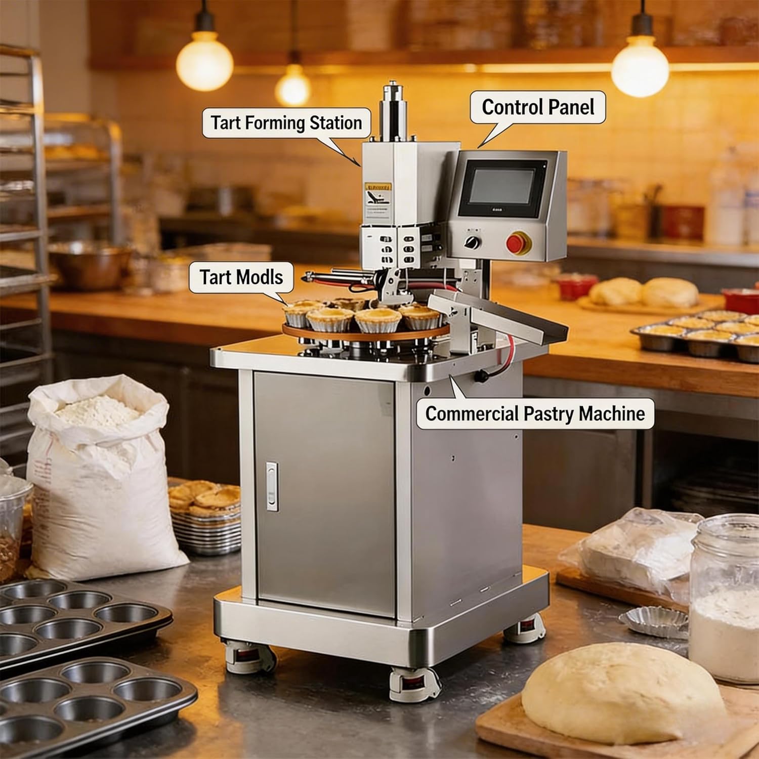 Streamline your tart production workflow with our commercial tart press machine featuring falling cup automation. This advanced egg tart former eliminates manual handling between forming and collection, creating a truly continuous production process that maximizes efficiency and minimizes labor requirements. **Seamless Production Flow** The integrated falling cup function represents a significant advancement in tart forming automation. Rather than requiring operators to manually remove each formed shell, the machine automatically ejects finished tarts onto your conveyor system or collection trays . This seamless transfer eliminates production bottlenecks, reduces labor costs, and allows a single operator to manage multiple machines simultaneously. For growing bakeries, this automation capability provides a clear path to scaling production without proportional staff increases. **Precision You Can Count On** The PLC-controlled pneumatic system ensures every tart shell meets your exact specifications, with consistent thickness, perfect edges, and uniform size batch after batch . The rapid heating mold capability enhances efficiency while maintaining the gentle handling delicate pastries require. Programmable recipe storage lets you switch between product types instantly, recalling optimal parameters for each formulation. **Built for Real-World Commercial Use** The stainless steel construction ensures easy cleaning and long-term durability, while the straightforward controls require minimal operator training. For bakeries ready to automate their tart production, this commercial press delivers the efficiency, consistency, and reliability that professional operations demand.