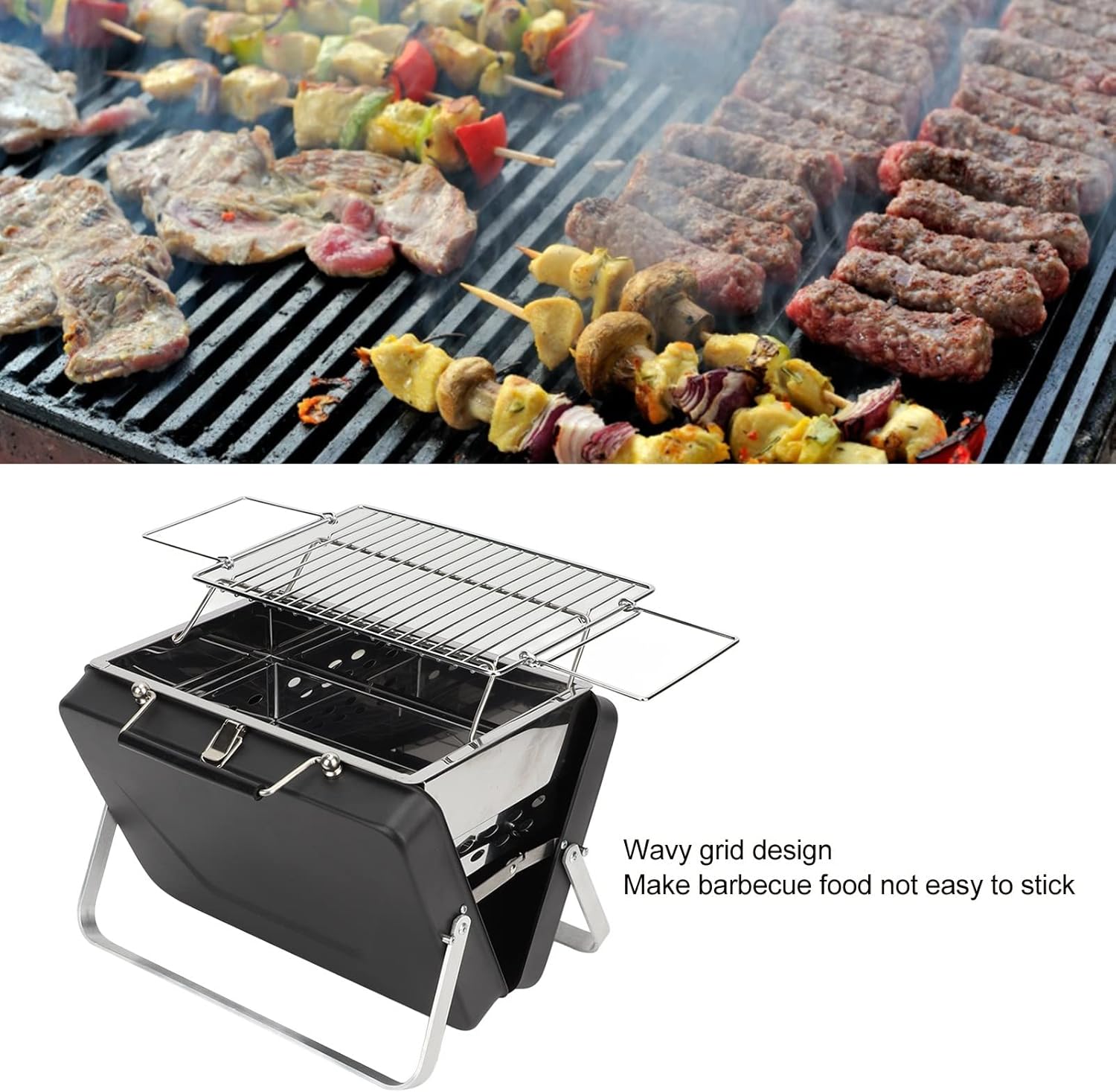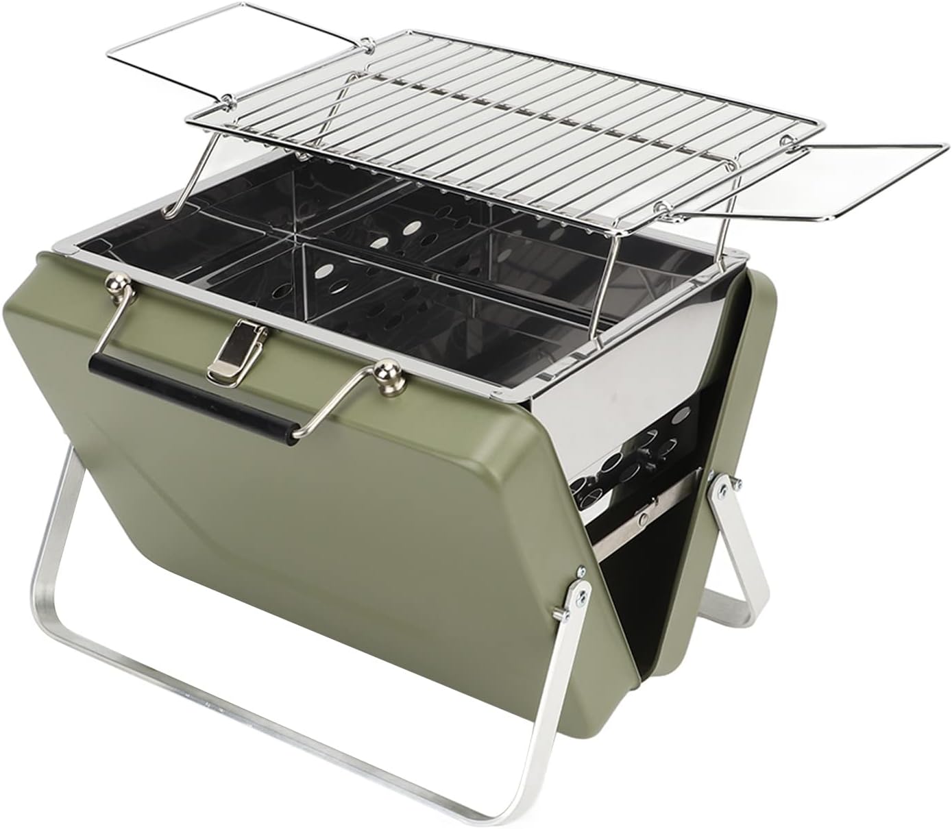Portable Camping Charcoal Grill, Folding Stainless Steel Stove for Outdoor Cooking BBQ Camping Hiking Picnic BackpackingSpecifications:Type: Portable Charcoal GrillUnfold size: 11.8in*9.0in*7.9in /30cm*23cn*20cmFold size: 11.4in*8.2in*3.1in /29cm*21cm*8cmNet weight: 3.9lb / 1.8kgProduct Materials:Body: Iron Powder CoatingCharcoal Tray: 410 Stainless SteelHandle: 201 Stainless SteelFeet: AluminumGrill Net: Electroplated IronIncludes: 1 x Grill, 1 x User ManualSafety Tips:Handle with care when hot; keep away from children.Use heat-resistant gloves when adjusting charcoal.Avoid use in strong winds or extreme weather.Clean after each use to maintain performance.Ensure charcoal is fully extinguished and cooled before disposal.