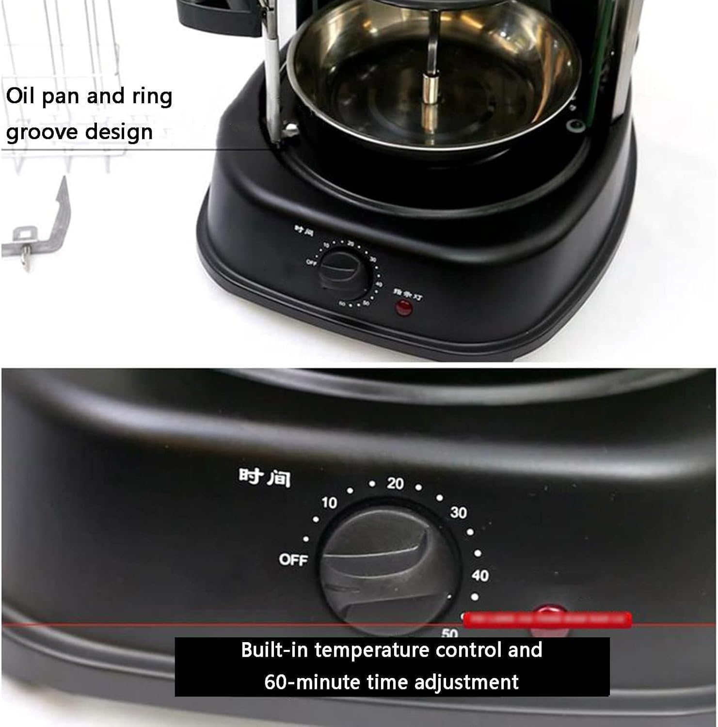 - Versatile Use: Roast Chicken, Roast, Turkey Kebab, Grill Fish, Kebab- Ring-shaped three-dimensional heating, no dead ends for baking, 60-minute timer, hands-free.- With automatic door lock protection function and open/close indicator light- Built-in oil pan, the grill does not leak oilSpecification:Voltage: 220VPower: 1500WTime: 60 minutesColour: BlackDimensions: 334X282X446MM (13.1*11*17.6 inches)Products include:1 * Vertical Rotisserie OvenNotes:1. Due to different monitors and lighting effects, the actual color of the product may be slightly different from the picture. Thank you!2. Due to manual measurement, please allow 2-5 cm measurement error3. If you have any questions, please feel free to contact us.◆ Thank you for visiting our store, have a great shopping experience!