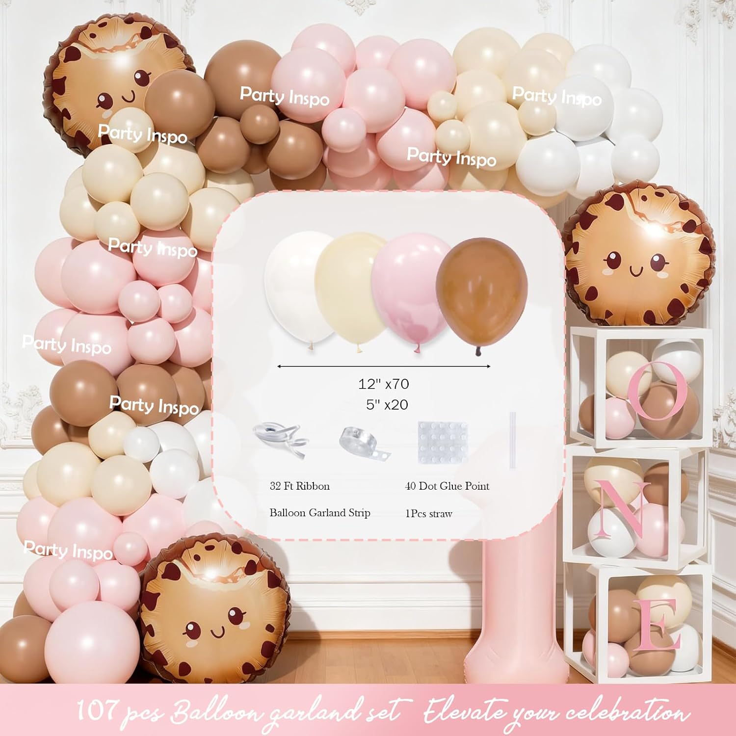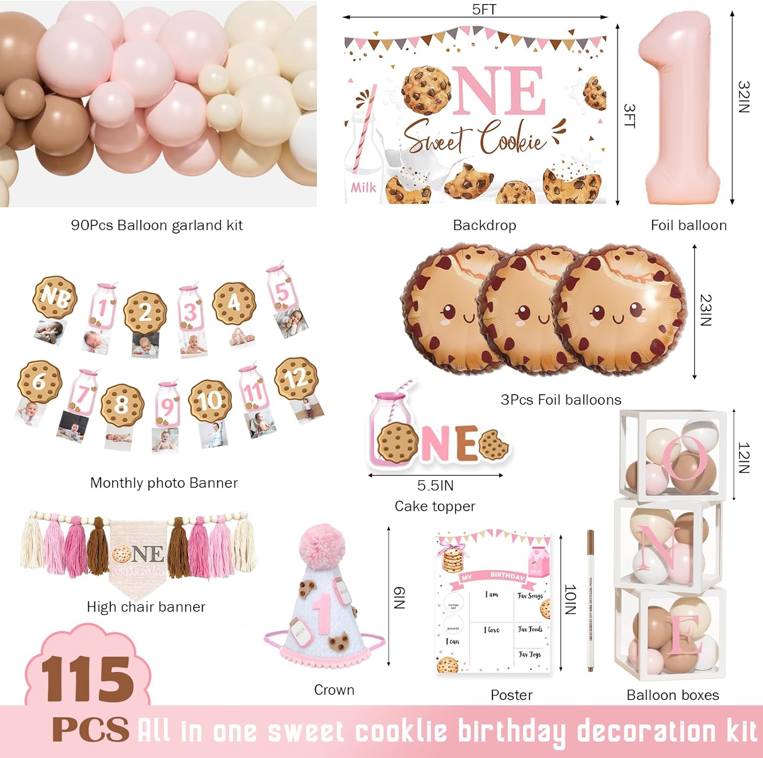 | Included Components | Milk and Cookies 1st Birthday for Girls, Number 1 & Cookie Foil Balloons, Poster, One Sweet Cookie Backdrop, Cake Topper, Photo & Highchair Banner, Birthday Hat, Pink & Brown & White & Ivory Balloons |