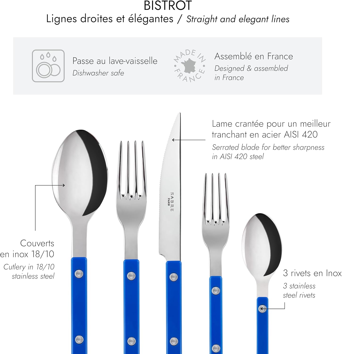 With the Bistrot collection, we drew inspiration from the places we adore: our restaurants, terraces, and cafes. When designing these cutlery pieces, our aim was to stay true to tradition while embracing modernity. The lines are simple, the rivets are present, and an array of colors and materials are incorporated. From vibrant red to soothing blue, with materials featuring horn or scale-like effects. Available in both glossy and vintage finishes, we are confident you will appreciate this collection, as we intended it to be both authentic and contemporary. The Sabre 20-Piece Box Set is your fundamental ensemble for assembling your tableware. It consists of 4 soup spoons, 4 table forks, 4 table knives, 4 teaspoons, and 4 dessert forks.