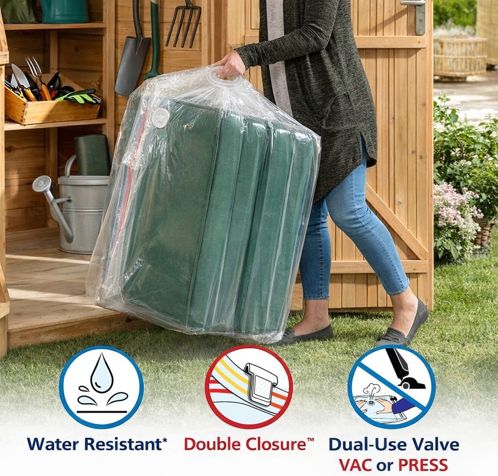 Tackle winter outdoor cushion storage with a simple, reliable solution built specifically for bulky patio pads. Shrink-Pak Outdoor Cushion Cube 2pk is designed for cushion storage and storage for outdoor cushions when the season changes and you need efficient storage for patio cushions. Each heavy-duty outdoor storage bag acts like a soft, xxl storage container for oversized seat pads, helping you shrink volume and reclaim space in your garage, shed, or closet. Perfect for outdoor furniture cushion storage, these cubes turn messy piles into tidy, stackable blocks so your storage for outdoor patio cushions finally feels under control. Each Outdoor Cushion Cube works like an outdoor cushion storage bag that’s made for repeated use. The reinforced, multi-layer, water-resistant material functions like durable furniture storage bags and outdoor furniture storage bags in one, helping protect against dirt, insects, and odors during long-term winter patio cushion storage. A dual-use valve lets you remove air with a vacuum or by pressing down manually, so you get strong compression without special equipment. The Improved Double Closure with easy-grip tab creates a secure, airtight seal, supporting waterproof cushion storage bag performance when contents are clean and dry before sealing. These outdoor storage bags waterproof style cubes are ideal for outdoor patio cushion storage, outdoor pillow storage, and cushion storage bin outdoor setups where every inch counts. Use them as extra large patio cushion storage helpers when you’re clearing the deck, prepping above ground pool storage for winter, or organizing a mixed corner of pool storage bag items and seat cushion bag cushions. The cube format stacks more neatly than irregular outdoor cushions storage bags, making it easier to line up bins, a 4 ft storage bin, or a 4ft storage bin along a wall without wasted gaps. Because each cube behaves like an extra large cushion storage bag and extra large outdoor cushion storage bags for patio furniture, you can handle larger sets without juggling multiple small totes. Pair them with a cushion box for storage on patio waterproof or an outdoor storage box with wheels for added protection and mobility. Whether you are planning winter outdoor cushion storage, consolidating outdoor storage bags waterproof options, or simply need a reliable bolsa de almacenamiento for seasonal gear, Shrink-Pak Outdoor Cushion Cubes give you a compact, protective, and reusable way to store more in less space.