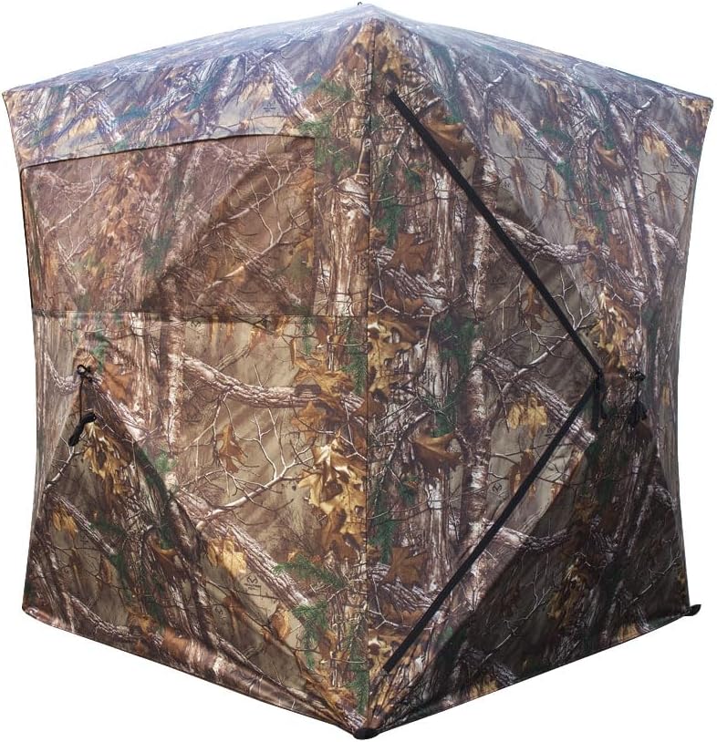 Thunderbay 2 Person Hunting Blind is ideal for hunters that need a durable, lightweight ground blind. The 270° visibility windows are easy to adjust from top, middle or bottom with a silent sliding system. The ground blind features Real hardwood and lead camo pattern with great concealment, and 5-hub pop up design can be easy set-up and take-down in less than 2 minutes, free carrying backpack allows easy transportation.