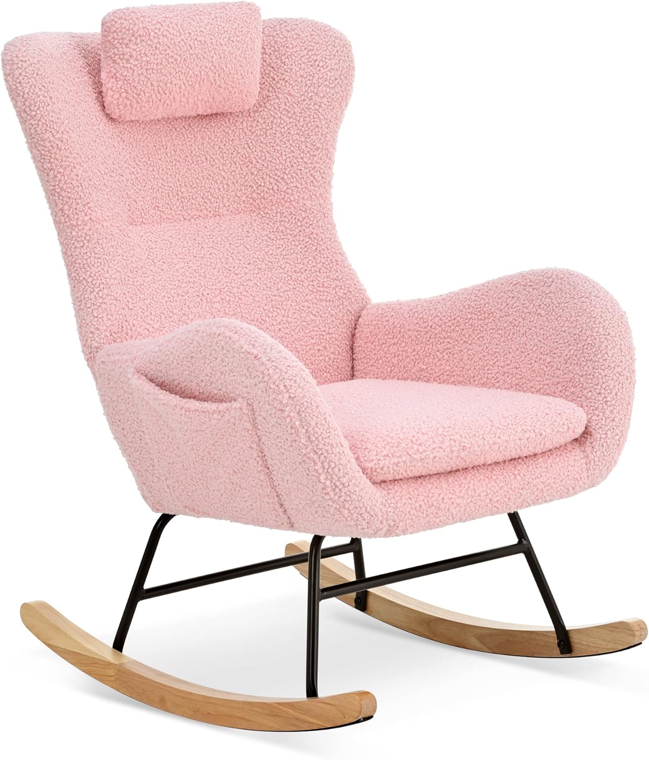 Product Features ★ Various colors available★ The seat area is wide, and the backrest and seat cushion are filled with high-density sponge, which is more elastic and not easy to deform, and conforms to ergonomic standards and human functions.★ The overall frame is made of iron and plywood to ensure structural safety. The base is supported by metal iron frame and rubber, which further improves the stability of the rocking chair without worrying about instability, and is suitable for long-term use.★ The rocking chair has a very soft cushion, which can provide you with enough wide space. The wide and high backrest provides you with great comfort, which can provide strong support for your whole body. The headrest can adjust its height, which will effectively support your neck and head. Combined with the rocking design, it can relax your body as much as possible. In addition, it is also a good gift for parents and friends.★ The side hanging pocket design can release space and store easily.★ The anti-skid pad at the end of the wooden leg provides a soothing effect. The swing is not more than 30 degrees, which is designed according to the most comfortable swing rhythm of the human body. It is not only suitable for the elderly to sit on the chair and read newspapers, but also suitable for the mother to sit on the chair and let the baby sleep.★ Use high-quality hardware connection, easy to install and durable. Just follow the instructions to install and enjoy in a few steps. Weights & Dimensions & Description Product Type: Rocking Chair Product size: 26.38 "W* 34.25"D *36.22 "H Seat Length: 18.11 " Seat Depth: 19.29" Seat Hight: 17.72" Height of Backrest: 18.5" Internal Frame Material: Internal Iron Frame+Plywood+Foam Internal Seat Material: Foam Internal Backrest Material: Foam Maximum Load Bearing: 220 LBS Carton Size: 26.2"W*11.6"D*27.2"H N.W.: 25.19LBS G.W.: 28.27LBS Material: Teddy Fabric Cover+Foam+Iron Frame+Toy Cotton+Rubber Wood Legs Assembly Method: Seat/Back/Leg KD
